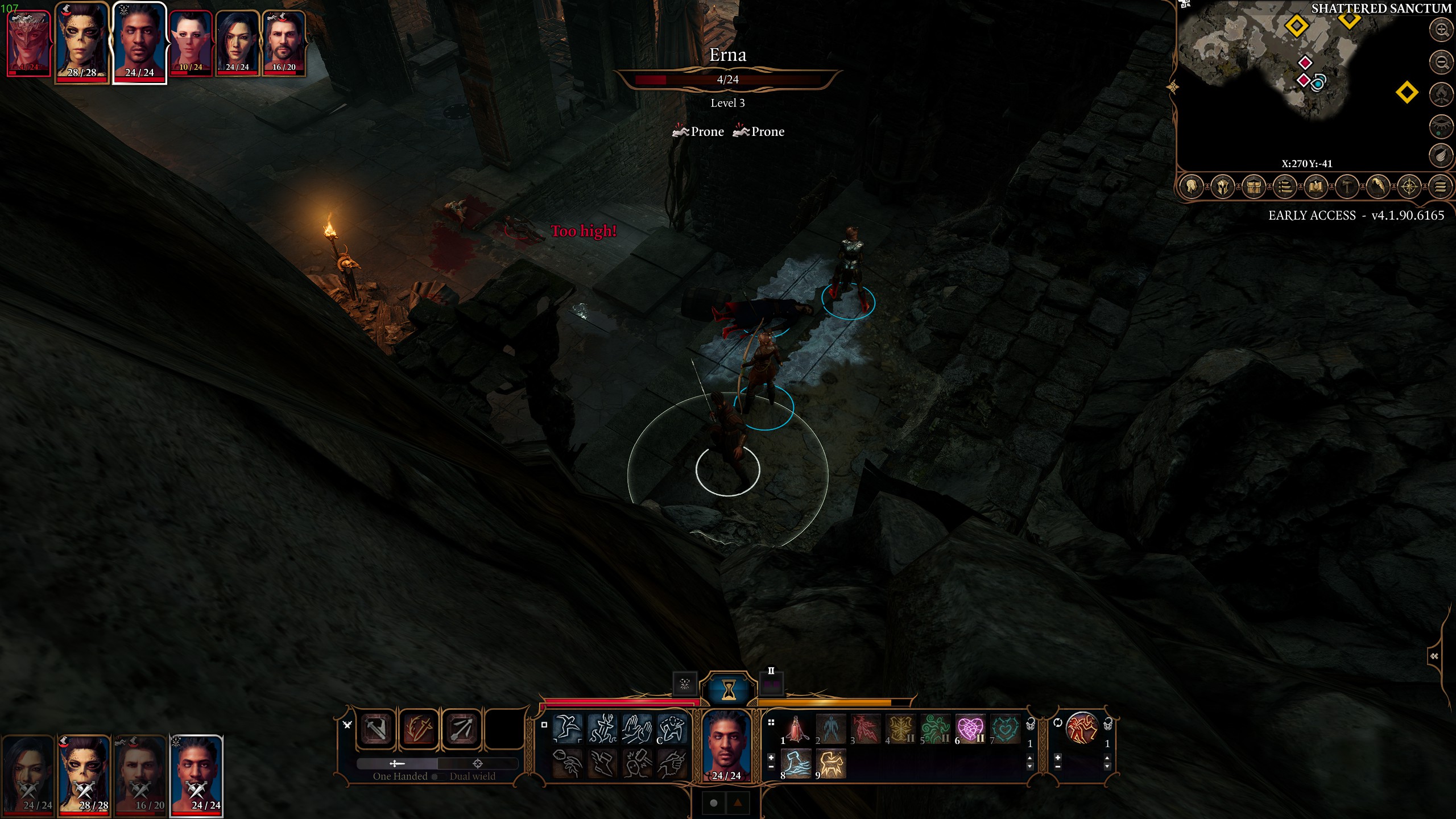 https://steamuserimages-a.akamaihd....A87AF195A5A207827B642B6AFC33ADCABFFE38A/So here's what happened to cause this. The character now with two prone conditions came up to the shelf where my party was, and cast a spell that left an ice surface behind, causing both her and Gale to slip and become prone. After that, I used Lae'zel's melee push attack on her and sent her prone form flying to the floor below, causing her to pick up the second prone condition. She was able to get up on her next turn no problem, clearing both prone conditions, but it's still a weird bug